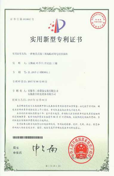 近日,從國家知識產權局傳來喜訊,公司申報的“一種便攜式施工現場臨時用電聯排插座”實用新型專利獲批,并頒發(fā)了國家實用新型專利證書。