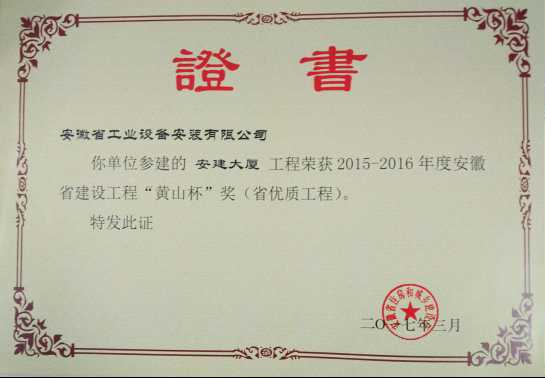 日前,2015-2016年度安徽省建設(shè)工程“黃山杯”(省優(yōu)質(zhì)工程)獲獎(jiǎng)工程項(xiàng)目名單公布,公司參建的“安建大廈”通過形式審查、現(xiàn)場(chǎng)復(fù)查、評(píng)審委員會(huì)評(píng)審等程序,同獲該項(xiàng)殊榮。至此,公司榮獲“黃山杯”達(dá)11尊。同時(shí)“濱湖中心1-3#樓空調(diào)系統(tǒng)工程 ”還榮獲2017年度中國安裝工程優(yōu)質(zhì)獎(jiǎng)(中國安裝之星)。