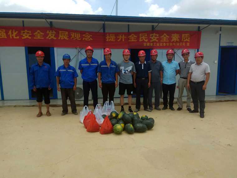 烈日炎炎,酷暑難當(dāng),6月28日上午,安裝安裝第四分公司經(jīng)理趙永峰在分公司副經(jīng)理姜田斌,工程科、安全科負(fù)責(zé)人的陪同下,來(lái)到廣東省清遠(yuǎn)市印染行業(yè)污水處理項(xiàng)目,看望和慰問(wèn)奮戰(zhàn)在一線的員工,為他們送去綠豆、白糖、西瓜、藿香正氣水、十滴水、仁丹等防暑降溫物品,實(shí)地察看了項(xiàng)目工地和職工生活區(qū),并與項(xiàng)目同志進(jìn)行了座談交流 。