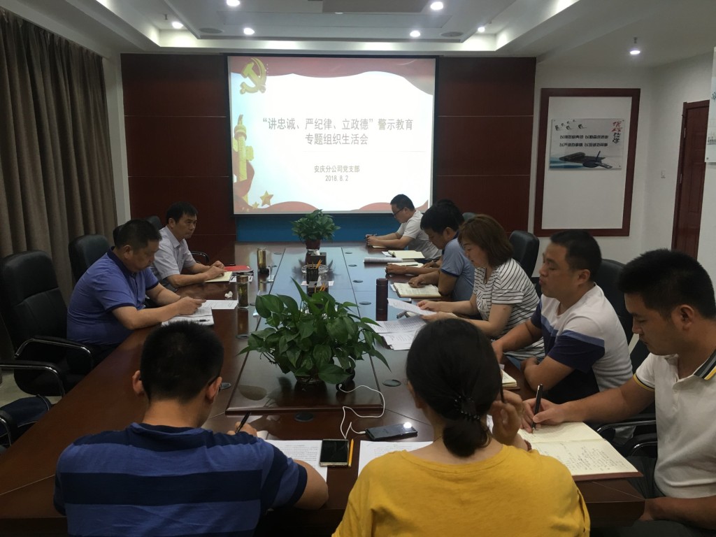 8月2日下午,安慶分公司黨支部組織召開了“講忠誠、嚴紀律、立政德”警示教育專題組織生活會,公司董事長、總經理、黨委副書記王軍邦,紀委書記、工會主席李寬旭到會指導。分公司領導班子成員、支部黨員參加了會議,會議由分公司黨支部書記劉紅艷主持。