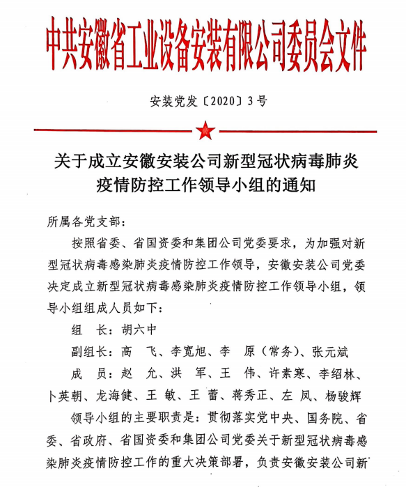 一是組織到位。1月26日,安徽安裝公司下發(fā)《關(guān)于成立新型冠狀病毒感染肺炎疫情防控工作領(lǐng)導(dǎo)小組的通知》,負(fù)責(zé)貫徹落實(shí)上級關(guān)于新型冠狀病毒感染肺炎疫情防控工作的重大決策部署,負(fù)責(zé)安徽安裝公司新型冠狀病毒感染肺炎疫情防控工作的領(lǐng)導(dǎo),研究解決安徽安裝公司疫情防控中的重大問題,統(tǒng)籌組織防控處置。