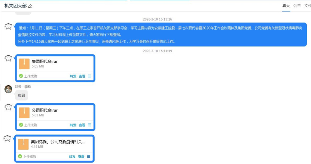 本次理論學(xué)習(xí)會為了縮短會議時間,采取集中學(xué)習(xí)與個人學(xué)習(xí)相結(jié)合的方式。會前已將學(xué)習(xí)材料分享至群文件,供大家自學(xué)查閱。會上全體團(tuán)員集中學(xué)習(xí)了安徽建工控股一屆七次職代會精神、安徽安裝第十六屆七次職代會精神及《安徽安裝公司關(guān)于切實做好復(fù)工復(fù)產(chǎn)前疫情防控工作的通知》文件精神。