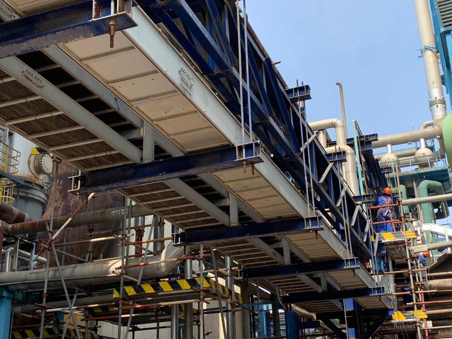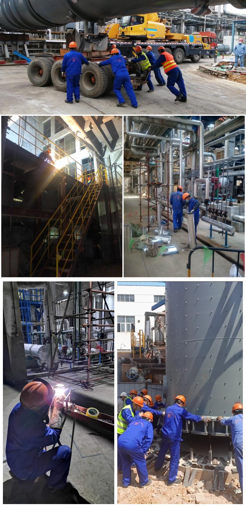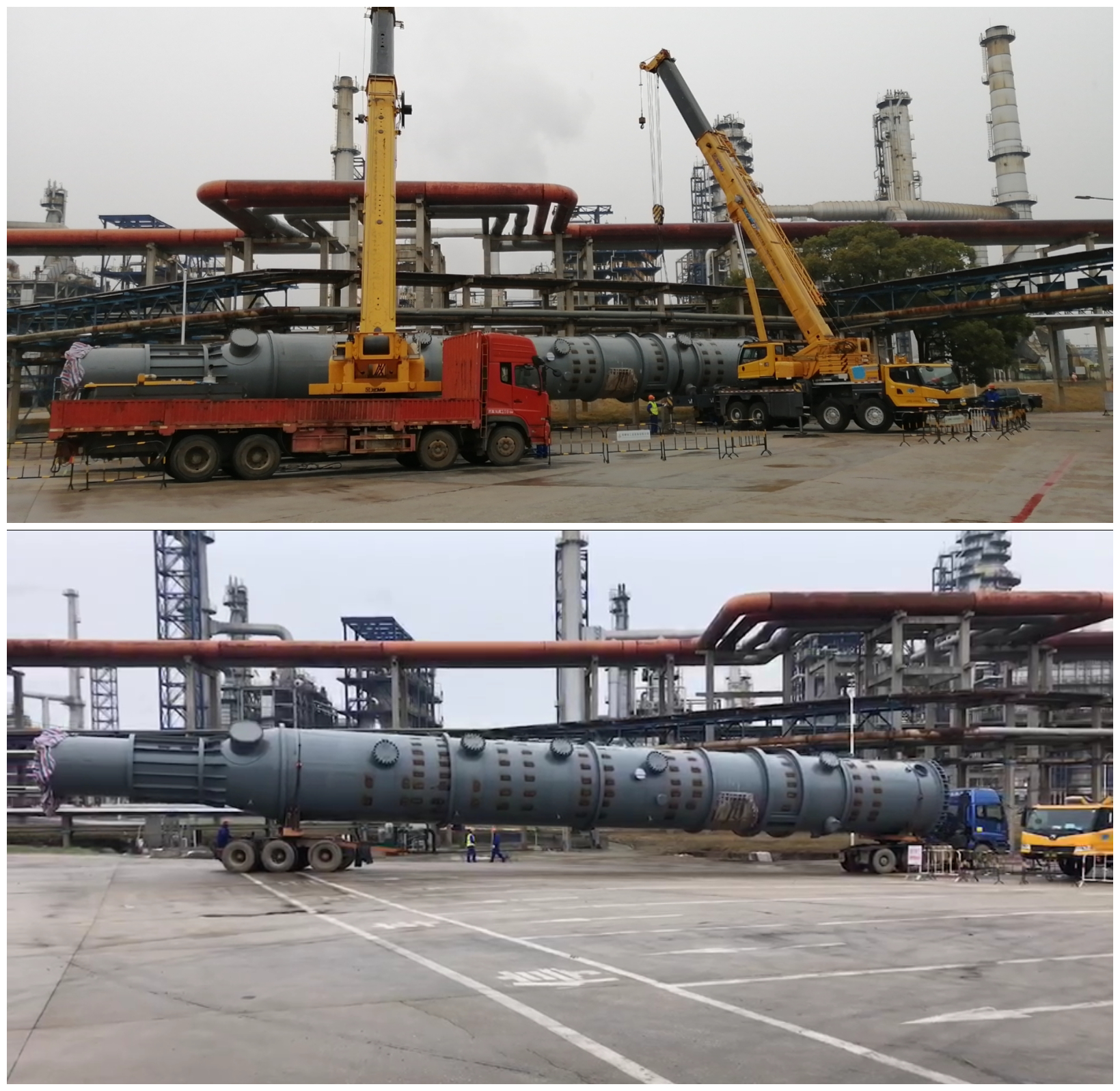 “Ⅰ、Ⅱ硫磺回收裝置增設(shè)煙氣后堿洗流程項目”是能使煙氣SO2排放濃度從原先的50mg/m3下降至≤10mg/m3的環(huán)保工程。但該項工程僅一個脫硫塔下段就高達33米,重達58噸,體積十分龐大,而現(xiàn)場存在作業(yè)場地狹小,固有障礙物多、吊重荷載大等諸多問題,無法將設(shè)備一次性運至施工現(xiàn)場并進行下段焊接梯子、平臺等附塔“穿衣戴帽”作業(yè)。對此,項目部多次優(yōu)化倒運方案,提前合理部署,采用額定荷載分別為220噸和90噸的汽車吊實施雙機抬吊作業(yè)和專為公路橋梁設(shè)計使用的炮車運輸,從而順利完成了倒運工作。同時,為爭取時間,安排班組實行夜間倒班制,管理人員輪班制,為接下來的脫硫塔“穿衣戴帽”和上下段空中組對焊接作業(yè)爭取了寶貴時間。