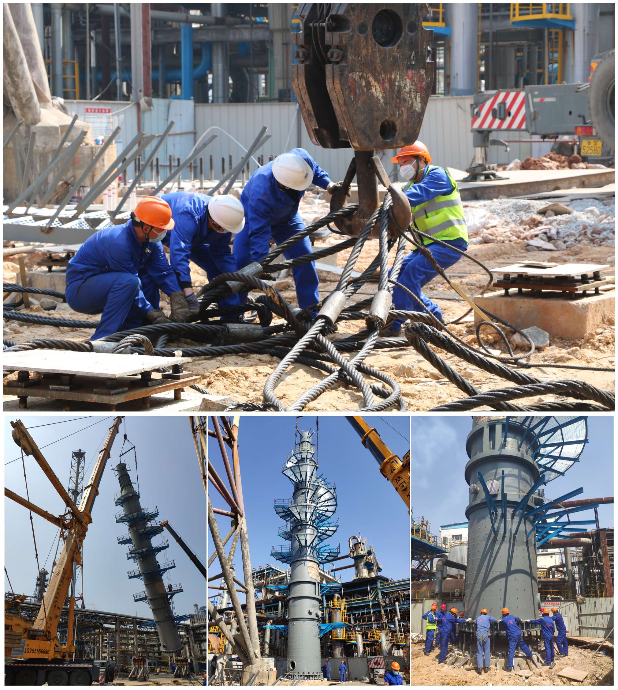 此次吊裝的脫硫塔下段,高33米,直徑3.043米,塔體及設(shè)備平臺(tái)、爬梯等附塔物總重達(dá)76噸。由于作業(yè)場(chǎng)地面積有限、周邊構(gòu)筑物障礙多、吊重荷載大等諸多困難,吊裝任務(wù)異常艱巨。對(duì)此,安慶分公司領(lǐng)導(dǎo)高度重視,提前謀劃,從地基處理、吊車站位、吊點(diǎn)選擇等角度,實(shí)地考察,制定針對(duì)性專項(xiàng)吊裝方案及防護(hù)措施,按照方案要求采用額定荷載500噸的汽車吊主吊,220噸的汽車吊溜索,實(shí)施雙機(jī)配合吊裝作業(yè)。吊裝前期,還特別邀請(qǐng)公司副總經(jīng)理高飛和相關(guān)部門負(fù)責(zé)人親臨項(xiàng)目現(xiàn)場(chǎng)進(jìn)行指導(dǎo)。