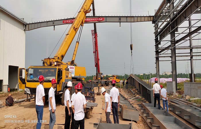伴隨著現(xiàn)場人員緊張而又激動的心情,第一拼40米大跨度的重型橫梁徐徐升起,并精準吊裝就位,這意味著經(jīng)過100多天的奮戰(zhàn)后,蕪湖項目鋼結構工程跨越了施工難度節(jié)點和取得了階段性突破,同時標志著該項目鋼結構工程最后的主體完工已邁出至關重要的一步。