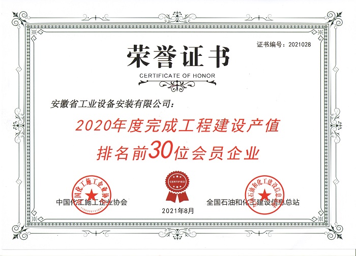 安徽省工業(yè)設(shè)備安裝有限公司榮膺中國 化工施工企業(yè)協(xié)會2020年度工程建設(shè) 產(chǎn)值排名前30位會員企業(yè)