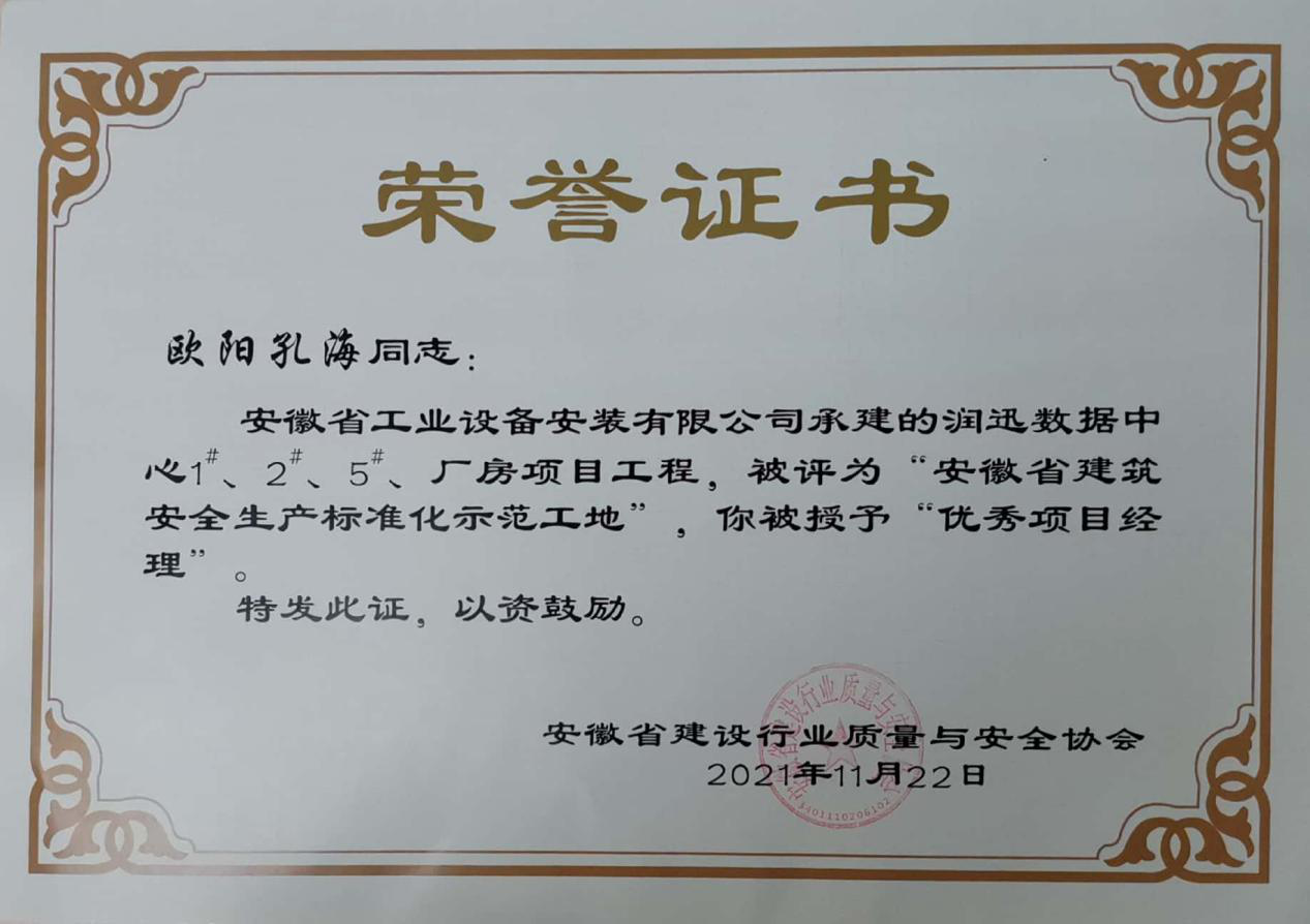 近日,安徽省工業(yè)設(shè)備安裝有限公司承建的潤迅數(shù)據(jù)中心1#、2#、5#廠房項目工程榮獲2021年度“安徽省建筑安全生產(chǎn)標(biāo)準(zhǔn)化示范工地”榮譽稱號。