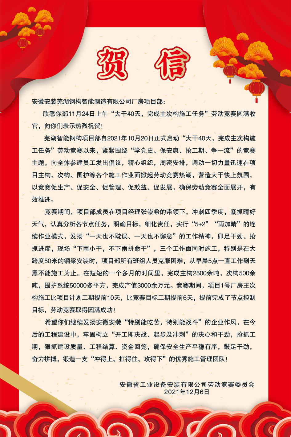 近日,公司勞動競賽委員會向蕪湖鋼構(gòu)智能制造有限公司廠房鋼結(jié)構(gòu)項(xiàng)目部和新疆托里縣污水處理廠中水回用配套設(shè)施工程項(xiàng)目部發(fā)出賀信,祝賀兩項(xiàng)目部勞動競賽圓滿完成!