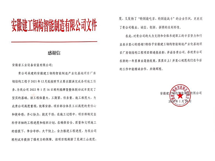 信中表示,安徽建工鋼構(gòu)智能制造有限公司廠房鋼結(jié)構(gòu)工程自開工以來,科學(xué)制定施工生產(chǎn)計劃,項目部全體員工以高度的責(zé)任心、使命感,齊心協(xié)力,鼓足干勁,在確保安全、質(zhì)量和文明施工的前提下,爭分奪秒,大干快上,全力推進(jìn)工程進(jìn)度。最終在2021年12月底前按照節(jié)點(diǎn)要求圓滿完成各項施工任務(wù),為業(yè)主單位順利揭牌暨整體聯(lián)動試車成功提供了強(qiáng)有力的保障,展現(xiàn)了敬業(yè)、誠信、創(chuàng)新、拼搏的良好形象。