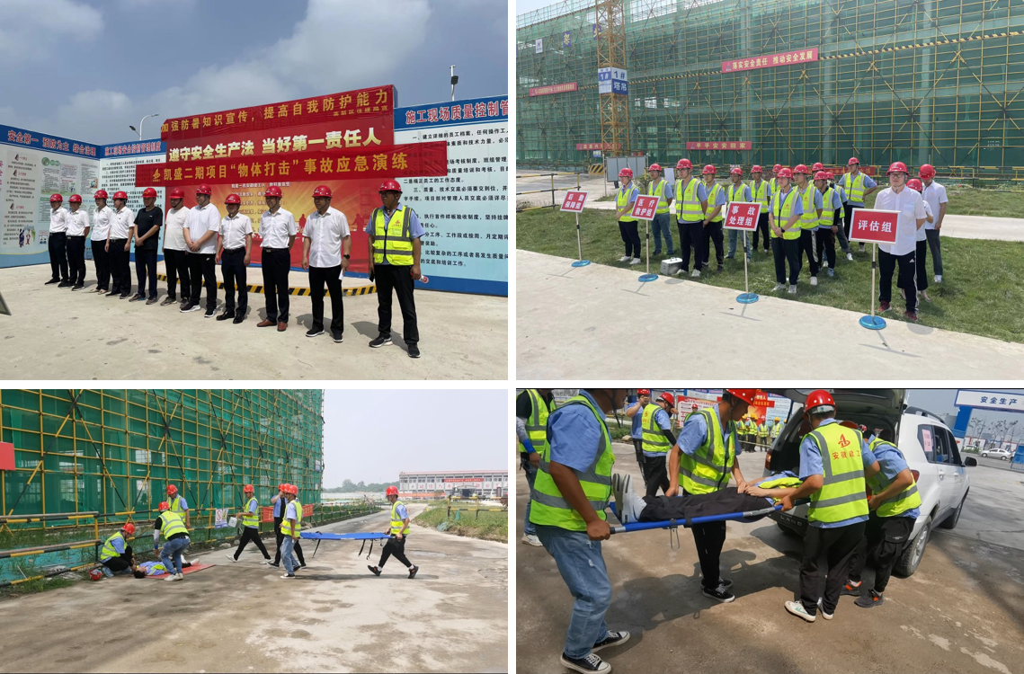 為了落實(shí)公司、分公司安全生產(chǎn)月的各項(xiàng)活動部署,進(jìn)一步提升施工現(xiàn)場人員的安全防范意識及應(yīng)急救援處置能力,6月20日上午10點(diǎn),蚌埠分公司、房建(裝飾)分公司在凱盛科技超薄柔性玻璃二期項(xiàng)目施工現(xiàn)場聯(lián)合開展了“物體打擊”事故應(yīng)急救援演練活動,公司安全管理部副經(jīng)理蔣秀正、蚌埠分公司領(lǐng)導(dǎo)班子成員、房建(裝飾)分公司領(lǐng)導(dǎo)班子成員、監(jiān)理單位代表、項(xiàng)目人員共30余人參加演練。