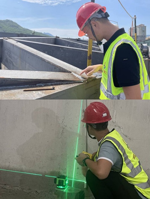 圖為岳西恒太城項(xiàng)目穹頂鋼結(jié)構(gòu)檢查及影廳看臺放線場景