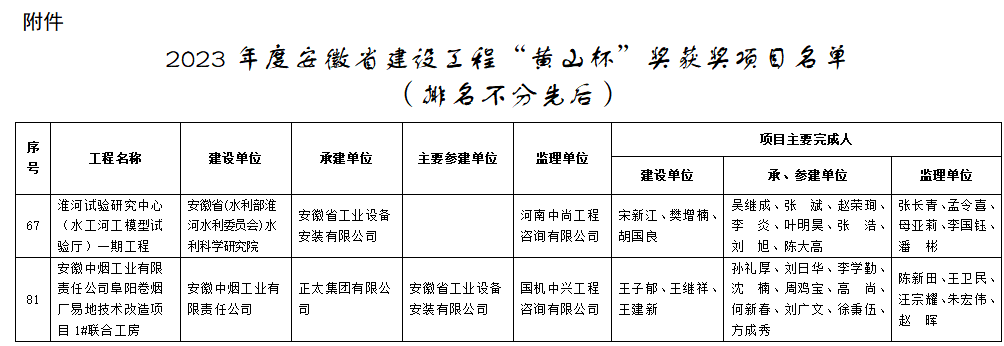 7月25日,安徽省住房和城鄉(xiāng)建設(shè)廳 、安徽省交通運(yùn)輸廳、安徽省水利廳聯(lián)合發(fā)布《關(guān)于公布2023年度安徽省建設(shè)工程“黃山杯”獎(jiǎng)獲獎(jiǎng)項(xiàng)目名單的通知》,由建工安裝集團(tuán)蚌埠分公司承建的“淮河試驗(yàn)研究中心(水工河工模型試驗(yàn)廳)一期工程”和參建的“安徽中煙工業(yè)有限責(zé)任公司阜陽(yáng)卷煙廠易地技術(shù)改造項(xiàng)目1#聯(lián)合工房”等2個(gè)項(xiàng)目均獲2023年度安徽省建筑行業(yè)建設(shè)工程質(zhì)量最高榮譽(yù)獎(jiǎng)“黃山杯”。其中“淮河試驗(yàn)研究中心(水工河工模型試驗(yàn)廳)一期工程”是建工安裝公司首次作為承建單位獲此殊榮;“安徽中煙工業(yè)有限責(zé)任公司阜陽(yáng)卷煙廠易地技術(shù)改造項(xiàng)目1#聯(lián)合工房”項(xiàng)目同時(shí)正在申報(bào)國(guó)家級(jí)安裝行業(yè)最高獎(jiǎng)項(xiàng)中國(guó)安裝工程優(yōu)質(zhì)獎(jiǎng)(安裝之星),5月份預(yù)檢已通過(guò),等待9月復(fù)檢。兩個(gè)項(xiàng)目作為承建和參建單位一舉捧得2樽“黃山杯”,也是蚌埠分公司歷史首次,同時(shí)也是蚌埠分公司近年來(lái)捧得的第5、第6樽“黃山杯”獎(jiǎng)項(xiàng)。