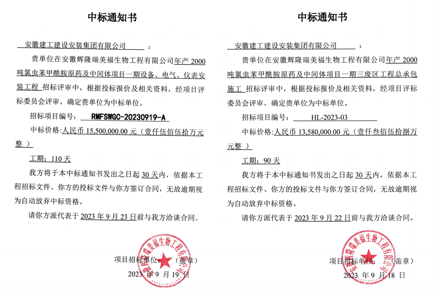 喜訊頻傳!建工安裝蚌埠分公司連續(xù)中標(biāo)安徽輝隆瑞美福生物工程有限公司年產(chǎn)2000噸氯蟲苯甲酰胺原藥及中間體項(xiàng)目一期三、四標(biāo)段工程