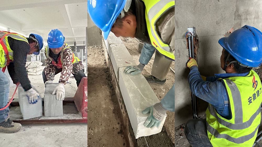 圖為:安徽理工大學(合肥高等研究院)維修改造項目(二期)室內砌筑材料搬運、新增隔墻砌筑及水電管線預埋施工