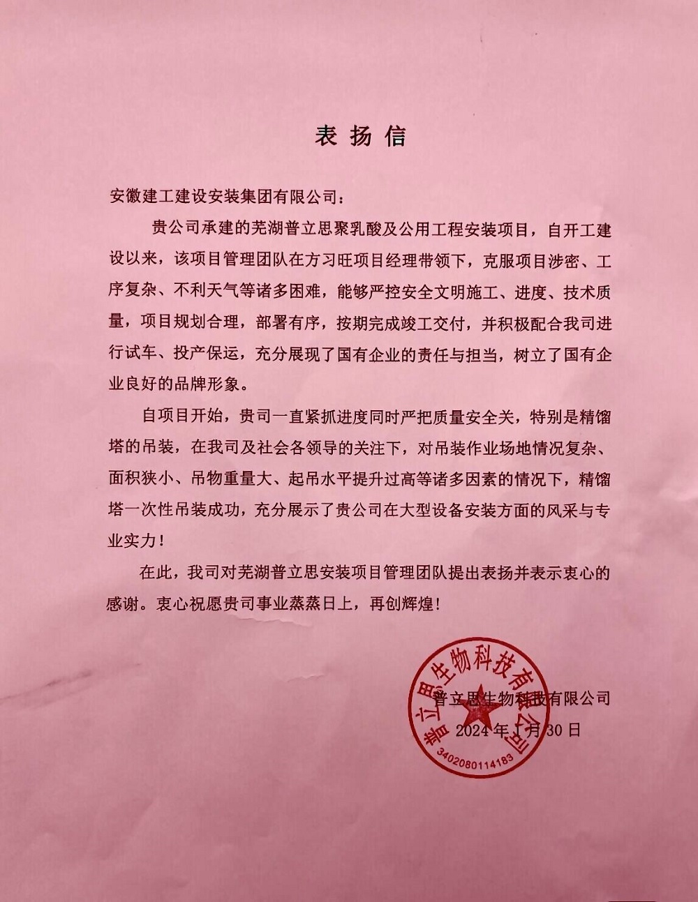 近日,建工安裝蕪湖普立思聚乳酸及公用工程安裝項目收到業(yè)主表揚信,對項目團隊在項目建設過程中主動作為、攻堅克難,敢于擔當、全力拼搏的精神予以充分肯定和高度認可,對公司及項目全體參建人員的辛苦付出和不懈努力表示衷心感謝和誠摯問候。